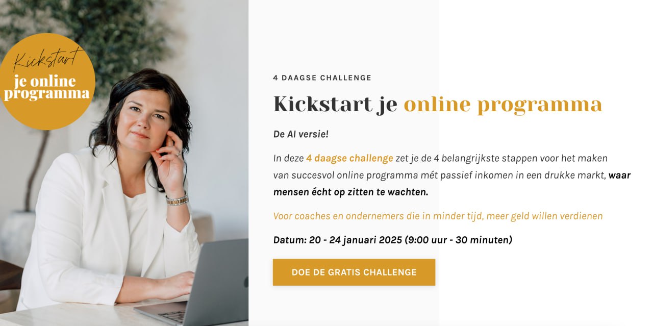 In januari geven we de live challenge: Kickstart je Online programma. We gaan in 4 dagen je online programma opzetten. Dit wordt de AI variant, want er kan tegenwoordig zoveel met AI.